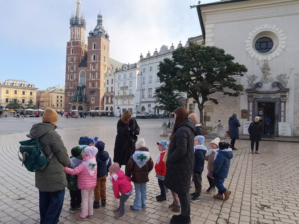 Pięciolatki wybrały się w poniedziałek, 15.09.2025 r. w ramach realizacji programu Klubu Odkrywców Krakowa we współpracy ze Staromiejskim Centrum Kultury Młodzieży na Rynek Główny.